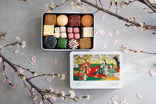 ホテル内に描かれたアートから、優美な花見のシーンを写し取った春限定のデザイン缶に、抹茶やごま、きなこなどの和素材をはじめとし、紅茶やココアなど味わい豊かな12種類のフレーバーをぎっしりと詰め合わせました。気品あふれるデザインは、お世話になった方に感謝を伝える贈り物や、春のお祝い行事の一品にもぴったりです。