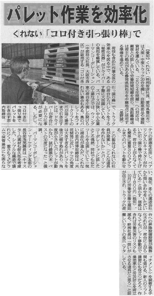 働く車のサポートをビジョンとする株式会社パーマンコーポレーション(本社:大阪市西区、代表取締役:中部祥元)が、2023年10月にお客様のお困りの声を商品化した『コロ付きパレット引っ張り棒』。