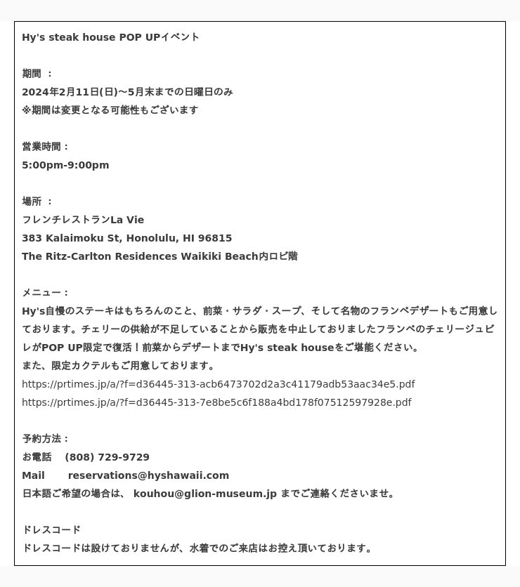 休業期間中、Hy's steak houseのお食事を楽しみにしてくださっているお客様へ期間限定で初のPOP UPイベントの開催が決定致しました。会場となるのは、同じG.LION HAWAIIが運営するThe Ritz-Carlton Residences Waikiki Beach内にあるLa Vie。ハワイの風が心地よく感じることができるオープンエアで、POP UPイベントを開催致します。