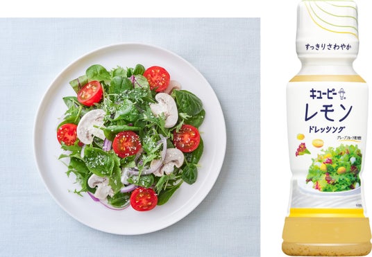 左WithGreen監修「ベビーリーフとマッシュルームのサラダ」(レモンドレッシング使用)、右「キユーピー レモンドレッシング」
