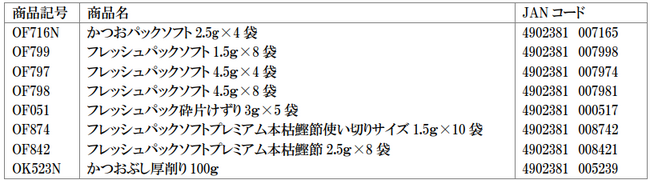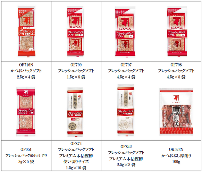既に百貨店商品の一部では先行して賞味期間延長を実施しておりますが、この度家庭用の主力商品を含むかつおパック類7品と、削り節類1品に賞味期間延長の適用範囲を拡大します。
