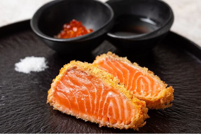 科学物質不使用。徹底した温度管理を行う、世界で唯一100%鮭の生産を行うアイセンサーモンは刺身クオリティのブランドサーモンです。レアカツは、生パン粉を使用し、サクっとした衣の食感と、脂乗りの良いサーモンのレア感をお楽しみいただけます。
