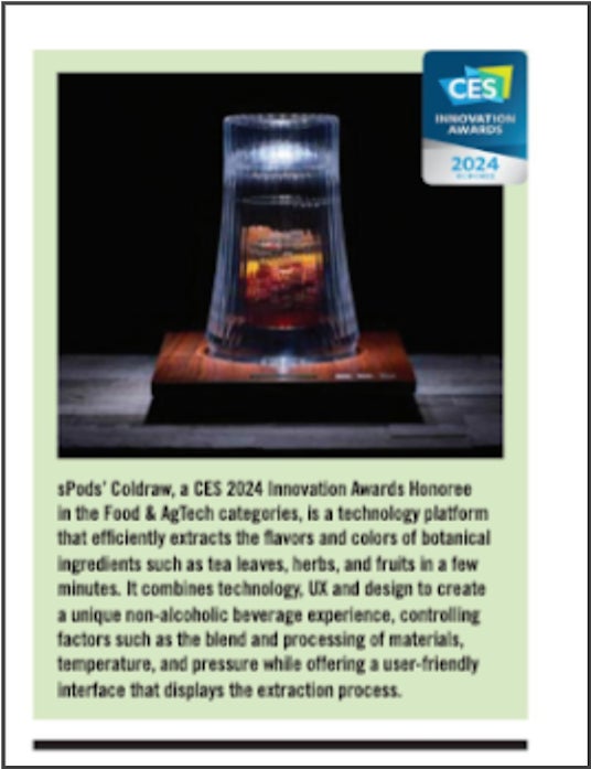 茶葉やハーブなどの植物素材(ボタニカル素材)から植物本来の味・色・甘味を10分程度*の短時間でバランスよく抽出する高品質クラフトノンアルコール飲料プラットフォームであるCOLDRAW(コールドロー)は、1月9日から12日まで米ラスベガスで開催された世界最大級の家電見本市であるCES 2024に出展しました。CES 2024ではFood & Tech部門でInnovation Awardを受賞した他、最新の抽出機器を2台展示し、来場した方々から好意的な評価をいただきました。