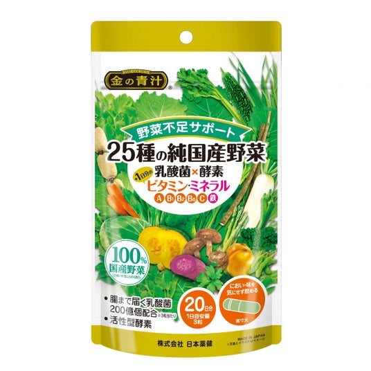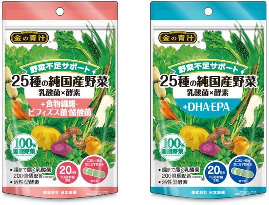 株式会社日本薬健(本社:東京都港区新橋二丁目20番15号、代表取締役:丸山 忠生)は、毎日の健康をサポートする"金の青汁 25種の純国産野菜サプリメント”から「金の青汁 25種の純国産野菜 乳酸菌×酵素 +食物繊維・ビフィズス菌・酪酸菌」「金の青汁 25種の純国産野菜 乳酸菌×酵素 +DHA・EPA」を、2024年3月4日(月)より全国のドラッグストアなどにて発売いたします※1。25種の野菜と、プラスαの成分もまとめてチャージすることができるサプリメントです。