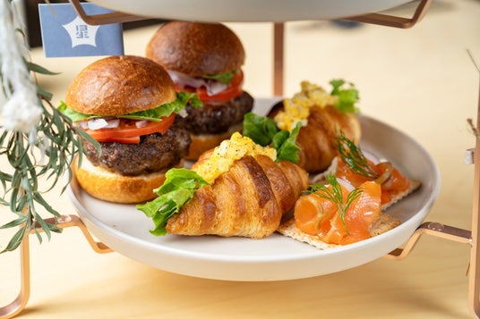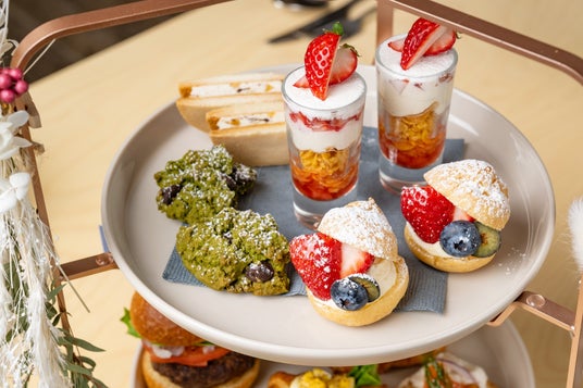 スイーツは軽やかな口当たりのソイクリームのプティシュー、おいしいプラントベースフード「wellbeans」の動物性食材不使用のノンバターサンド(ラムレーズン)、いちごのミニパルフェや全粒粉とソイミルクを使用したミニパンケーキをご用意。セイボリーでは、アフタヌーンティーでしか食べられない放牧牛のスライダー、平飼いたまごのクロワッサンサンド、そして産地を厳選した紅富士とひよこ豆チーズのカナッペをご堪能いただけます。また、大人気プラントベースのアメリカンベイクショップ「ovgo Baker」の抹茶チョコレートスコッキーもメニューに組み込みました。スコッキーはスコーンとクッキーを掛け合わせたハイブリットスイーツで、卵もバターも使用しないプラントベース仕様となっております。