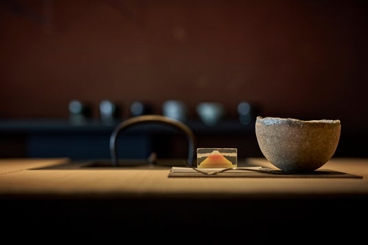 岐阜高山の左官職人、挾土秀平氏によるまるで壁画のような左官壁と木曽ヒノキで設えた天井意匠がゲストを迎える「立礼茶室」は、中部ならではのおもてなし空間。天空の茶室で、この地に根づく茶の湯の文化に思いを馳せながら、お抹茶と和菓子をお楽しみください。