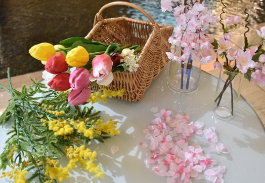 店内で“フラワーブッフェ”を開催!ティースタンドに花を添えてパステルグリーンのリボンが飾られたティースタンドをセルフプロデュースしていただけるよう、ミモザやチューリップ、さくらなど春らしいお花を、フラワーブッフェスタイルでご用意いたします。お好きな花をチョイスして、自分好みに撮影をお楽しみいただけます。