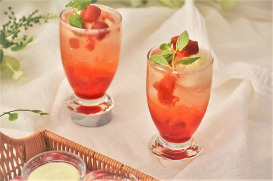 いちごの果肉とバニラアイスクリームをトッピングした特製いちごソーダ