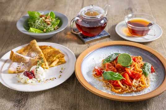 写真は【パスタセット】2500円(税込)~サラダorパスタ、選べるパスタ、選べるハーフクレープ、選べるドリンク※お選びいただく内容によって価格が変動します