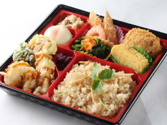 筍ごはん、筍土佐和え、菜の花のからし和え、季節の天ぷら(さわら・筍・菜の花・海老)、こだわりの手作りすき焼きコロッケとだし巻き玉子、卯の花、ひとくち桃まんじゅうと旬のお惣菜を詰め合わせた春限定の華やかなお弁当です。