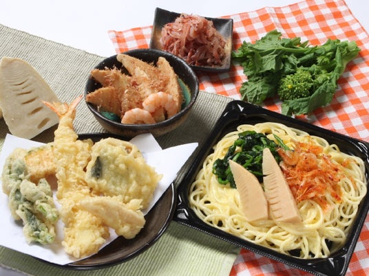 写真上:海老と筍の土佐和え 350円(税込378円) 写真左:さわらと春の味覚天盛り 480円(税込518円) 写真右:桜海老と春のクリームパスタ 699円(税込754円)