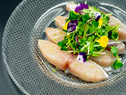 産卵期前で最も脂が乗った、旬の寒サワラをフレッシュライムの果汁やオリーブオイルで味を整え、サワラ本来の甘みを生かした味わいに仕上げました。