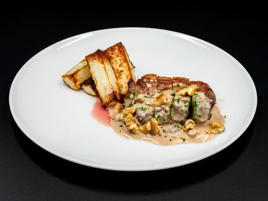 中でも旨みの凝縮された肩ロースを丹念に焼き上げ、エシャロットと白ワインを煮詰め、白胡麻ペーストと合わせたソース、最後に香ばしく炙った胡桃で仕上げました。