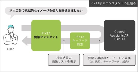PIXTA検索アシスタントは、ニーズや目的から ストックフォト向けの具体的な検索キーワードを導出するAPIをOpenAI のAssistants API(モデル:GPT4) を使って作成しました。