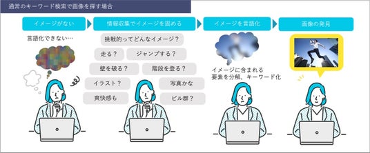 PIXTA検索アシスタントでは「情報収集によって自分が求める画像イメージを固める」「脳内イメージに含まれる要素を分解、描写することで検索キーワードに落とし込む」という工程を省くことが可能です。