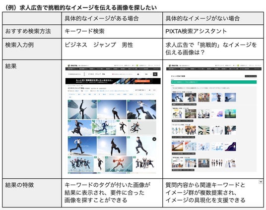 (例)「求人広告で挑戦的なイメージを使える画像を探したい」場合、具体的なイメージがある人は、従来の「キーワード検索」がおすすめ。一方、まだ具体的なイメージがない場合はアイデアを集められる「PIXTA検索アシスタント」が適しています。