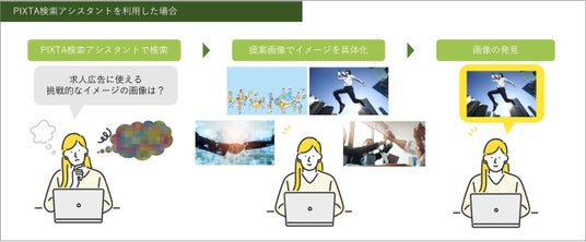 これにより、まだイメージが固まっておらず、画像検索における具体的な検索キーワードが思いつかなくても、利用者の用途や抽象度の高いニーズからPIXTAがイメージの具体化・言語化を補助し、複数の画像素材を提案いたします。
