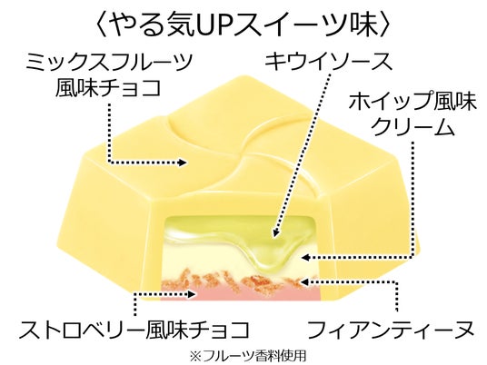 ミックスフルーツ風味チョコとホイップ風味クリーム、ザクザク食感のフィアンティーヌなどを組み合わせ、ゲーム内に登場するアイテム“やる気UPスイーツ”を再現しました。