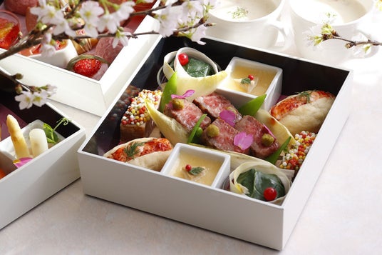 毎年ご好評を頂いている「GOTENYAMA SAKURA BOX」が今年も咲き誇る御殿山の桜とともに登場します。色鮮やかな旬の食材を集めた春を満喫できる華やかなお花見弁当。ハマグリのマリニエールやサフランソースをまとったサワラの西京焼き、旬の桜海老とグリーンピースのキッシュなど、見た目も味わいも春を感じる華やかな料理を和モダンな三段のお重スタイルで提供いたします。