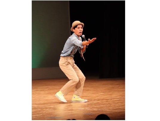 ▲沖縄の現状を笑いに変え伝える小波津正光さん