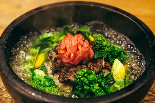 和牛ユッケに柔らかく炊いた牛テールと春野菜を添えて、濃厚なテールスープを豪快に注ぎ入れて仕上げます。たち昇る香ばしい香りが食欲をそそる新作の石焼スープリゾットです。