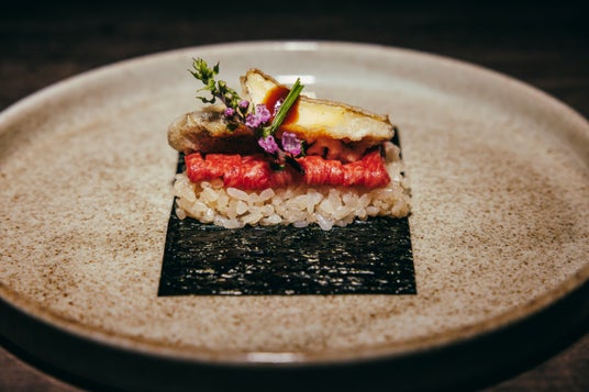 揚げたての“鮑の天ぷら”を主役に、厳選した和牛の赤身とキリッとした赤酢のシャリを、磯の香り豊かな極上海苔“こんとび”で包んでお召し上がりください。