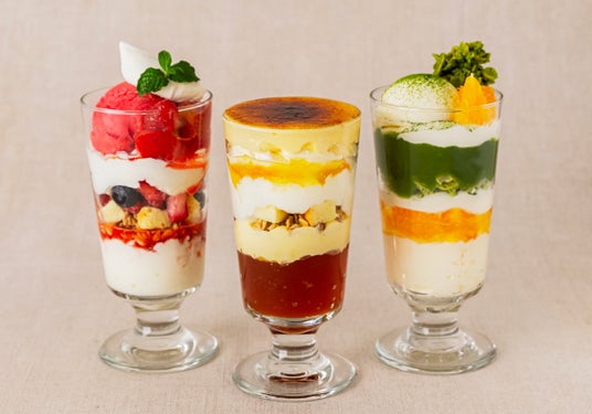 左から「ベリーとミルクのパフェ」「レモンと紅茶のブリュレパフェ」「オレンジと抹茶のパフェ」