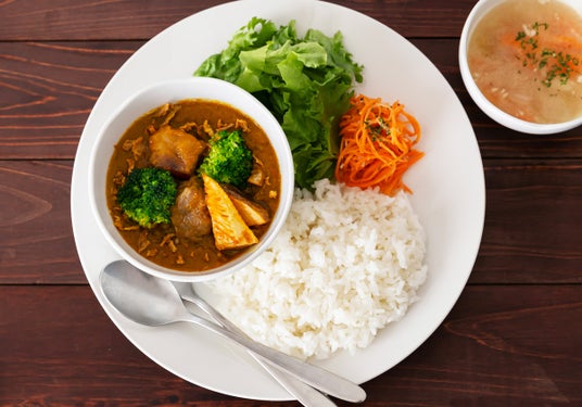 スパイスの効いた和風ベースのオリジナルカレー。ゆとりの空間オリジナルのだしを使用し、やさしい甘みの中にスパイシーさとコクも感じられる、和風ベースのカレーに仕上げました。トロトロになるまでやわらかく煮込んだ豚肉と、素揚げした旬の野菜が楽しめます。