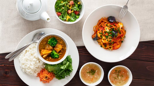 メインのおかずから2品と、副菜2品、ごはん(白米または雑穀米)、みそ汁、香物、ミニデザート1品、ドリンクのセットです。