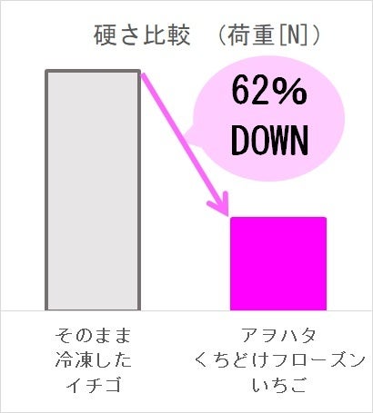 一方、本品は独自技術「やわらかフローズン製法※1」により“凍ったままでやわらかい”食感を実現しています。そのまま冷凍したイチゴに比べ、果肉が62%やわらかく、冷凍庫から出してすぐでもミキサーにかかりやすい適度な硬さです(グラフ参照)。またあらかじめ果汁につけてあるため、そのままでも程よい甘さがあります。そのため、甘みの調整や氷も必要なく、牛乳と本品だけで手軽に滑らかなスムージーを作ることができます。より手軽にフルーツを使ったスムージーを楽しみたい、というニーズに応えることができる商品です。