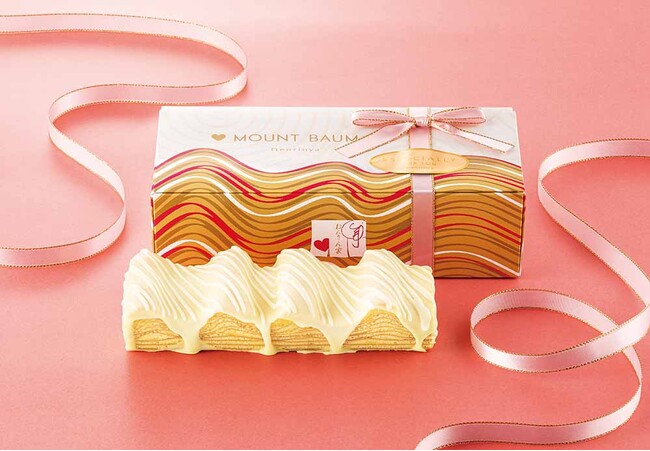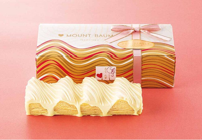 ねんりん家の代表作「マウントバーム しっかり芽」に、ホワイトショコラを一面にとろりと流しかけた、スペシャリティな一品。ねんりん家がこだわり続けるバターリッチな味わいと、くちどけの良いミルクのコクが繊細に重なり合う特製バームクーヘンです。その上からさらに、流麗なミルキーラインでドレスアップ。ホワイトデーにふさわしい“白い山並み”と、特別な日にぴったりなリボンの装いで、皆様においしい思い出をお届けいたします。
