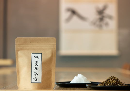 金沢で古くから親しまれている焙煎された香ばしい香りと軽やかな渋味が特徴の加賀棒茶の粉末と、千島寒流と対馬暖流が交錯するミネラル豊富な日本海の海水で作られた塩を合わせた「加賀棒茶塩」。
