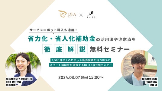 飲食店DXを推進するロボティクスソリューションカンパニーである株式会社DFA Robotics(本社:東京都渋谷区、代表取締役社長:波多野昌昭、以下「DFA Robotics」)と日本最大級の補助金・助成金ポータルサイト「スマート補助金」を運営する株式会社BLITZ(本社:東京都渋谷区、代表取締役CEO:伊神潤、以下「BLITZ」)は、2024年4月から申請受付開始が見込まれている「省力化・省人化補助金 / 中小企業省力化投資補助金(仮称)」について、2024年3月7日(木)15:00から参加無料の共催ウェビナーを開催いたします。