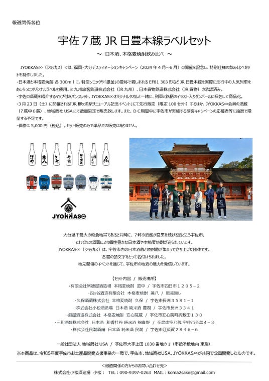 ・3月23日(土)に開催される「JR柳ヶ浦駅リニューアル記念イベント」にて先行販売(限定100セット)するほか、JYOKKAS∞会員の酒蔵(7蔵中6蔵)、地域商社USAにて数量限定で販売致します。また、DC期間中に宇佐市が実施する誘客キャンペーンの応募者等に抽選で贈呈する予定です。
