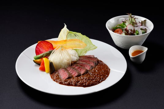 ビーフブイヨンにソテーオニオン、クミンやカルダモンなどの香り高いスパイスを加えた濃厚な味わいの欧風カレー。ライスは、京都の老舗米屋「八代目儀兵衛」が、数種類のお米をルゥの味わいに合わせて最適なバランスでブレンドしたお米を使用しました。具材は、柔らかくてジューシーな「大阪ウメビーフ」のほか、ホテル開業10周年にちなんで10種の彩り野菜 (泉州たまねぎ、ニンジン、アスパラガス、カボチャ、泉州水なす、赤パプリカ、黄パプリカ、サツマイモ、キャベツ、ビーツ) を添えました。