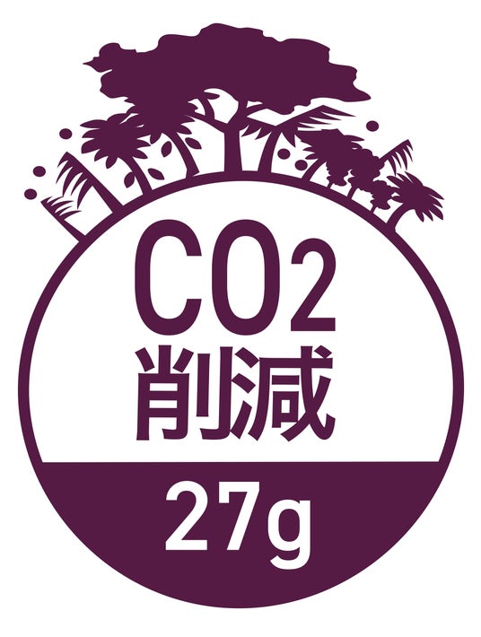 パッケージには、アサイーが栽培されているアグロフォレストリー農法のCO2 吸収量を、一製品あたりの削減量として換算した「CO2削減マーク」を表示しています。これは、商品に使用している、株式会社フルッタフルッタ(本社:東京都千代田区、代表取締役社長:長澤誠)のアサイーピューレに基づく削減数値です。フルッタフルッタ社の取り扱うアマゾンフルーツは、アマゾンの森林再生活動とともに展開する「アグロフォレストリー(森をつくる農業)」で収穫されたもので、CO2 削減量の表記が認められています。(環境省認定)
