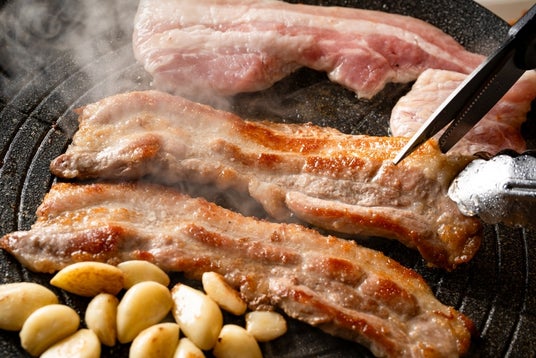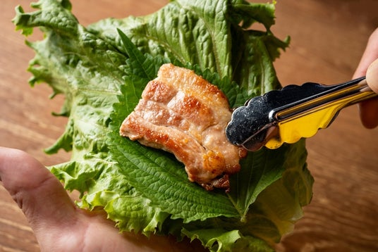 焼いて余分な脂がほどよく落ちた豚バラ肉は、脂身はカリカリ、肉はジューシーで濃厚な味わいに。大きなサンチュやエゴマで巻けば、肉の旨みはそのままに、さっぱりとお召し上がりいただけます。