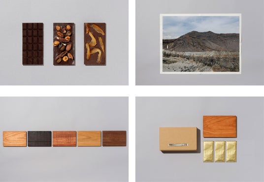 画像左上: ショコラタブレット、右上: タブロイド、左下:端材木皿プレート、右下: パッケージ、ショコラタブレット、端材木皿プレート