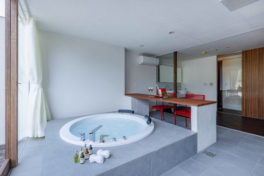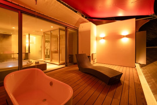 2023年の「本館モアナコーストの全室プライベートサウナ付きリニューアル」に続き、2024年は「別館離れヴィラベルトラモントの全室プライベートサウナ&プライベートデッキ&専用水風呂付きリニューアル」を実施、これに伴い日本初*の全室にプライベートジェットバス(露天風呂/半露天風呂)・プライベートサウナが付いたメゾネット客室に生まれ変わりました。