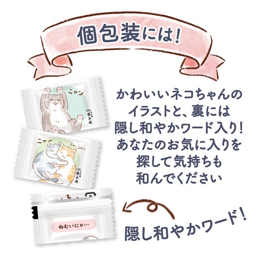 個包装には数種類の猫のイラストと、裏には隠し和やかワード入り。