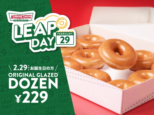 クリスピー・クリーム・ドーナツ・ジャパン株式会社(本社:東京都渋谷区、代表取締役社長:若月 貴子、以下:KKDJ)は、4年に一度となる2月29日に誕生日を迎えるお客様へ、『オリジナル・グレーズド(R) ダズン』を特別価格229円(本体価格)でご提供するキャンペーンを、クリスピー・クリーム・ドーナツ全店舗※1 において、2024年2月29日(木)限定で実施します。※1 催事及びKKD店舗以外の小売店を除く