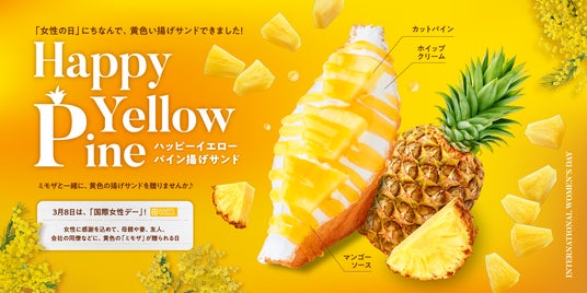 東京・銀座の揚げサンド専門店【Age.3 GINZA(アゲサン ギンザ)】は、2024年3月1日(金)から国際女性デーのハッピーイエローを取り入れた、『ハッピーイエローパイン揚げサンド』を3月限定で販売。