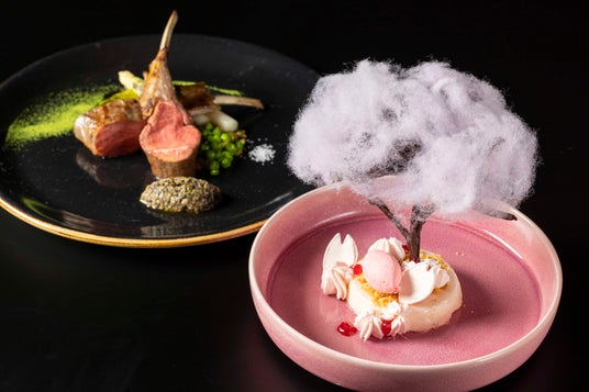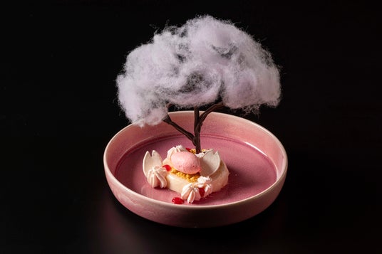 桜風味のレアチーズケーキに満開の一本桜を咲かせました。桜の花を模した綿菓子は、オーダーを受けてからオープンキッチンに設置した綿菓子機で作成します。イチゴのシャーベットとラズベリーソースの酸味が合わさり、キュンと甘酸っぱい季節を感じられる一皿です。