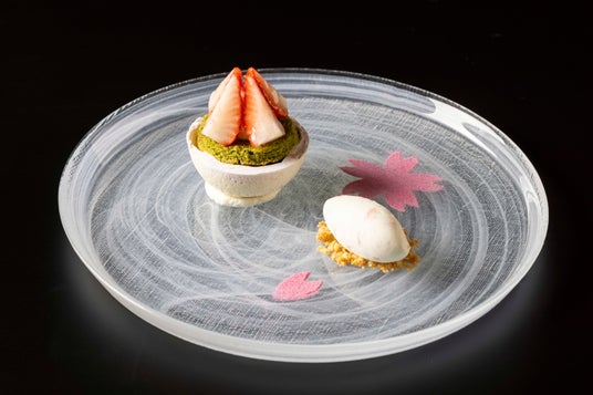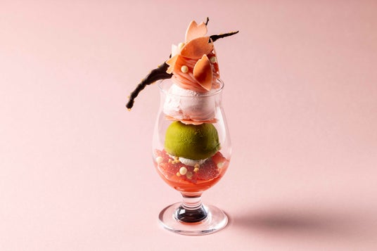 桜の香りをつけたイチゴのジュレの上に、きな粉のクランブル、抹茶と桜の2種のアイスクリームを重ね、桜のモンブランクリームを絞りました。桜の花びらが春風に舞い散る様子をイメージした飾り付けが優美な春の雰囲気を演出します。