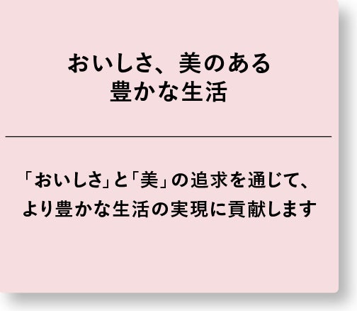 100年前から続く、食用油を通した「おいしさ」と「健康」価値の提供への想いは、「日清オイリオグループ ビジョン2030」の中でも「共有価値を生みだす6つの重点領域」の2つに掲げています。これからもこの変わらぬ想いを、お客様のもっと近くへお届けしてまいります。