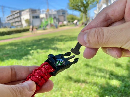 リュックサックにつけたり、ブレスレットとしてワンポイントにするなど、アウトドアがより一層楽しくなること間違いなし。火打石付き。