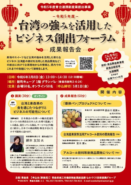 この度、台湾との食を通じたビジネスの可能性に関する講演とこれまでの成果を紹介するフォーラムを開催しますので、県内企業の方々をはじめ、支援機関の職員など、台湾とのビジネス交流、新商品開発などに関心のある方は、ぜひご参加ください。