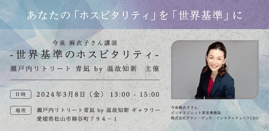 旅の目的地となる宿(=デスティネーションホテル)をプロデュースする株式会社温故知新(本社:東京都新宿区新宿、代表取締役:松山 知樹)が運営するスモールラグジュアリーホテル「瀬戸内リトリート 青凪 by 温故知新」(所在地:愛媛県松山市、総支配人:下窪 日登美)では、2024年3月8日(金)にホスピタリティ業界の未来を見据えた特別講演イベント「世界基準のホスピタリティ」を開催いたします。