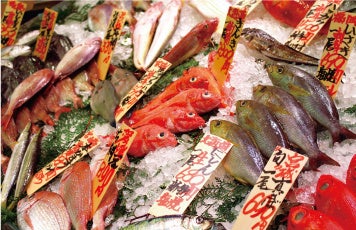 豊富な魚介類、素材の新鮮さが自慢です。お客さまとの信頼関係を大切にしたいという思いから、対面販売にこだわり、お刺身やお寿司など、ご要望に合わせてお造りいたします。また、素材を活かした魚料理のご提案もいたしております。