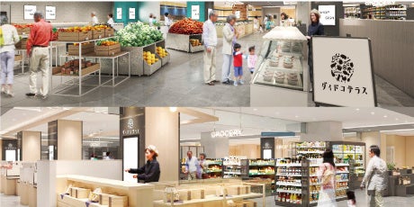 毎日の食卓を彩る食の専門店を集積したフロア。種類豊富な「おいしい」がつくられるダイドコロ。「おいしい」が集まり、くつろぎの場となるテラス。「おいしいもの」につられて一人ふたりと集まることで、新たなハッケンやオドロキを感じられるような場が、「ダイドコテラス」です。